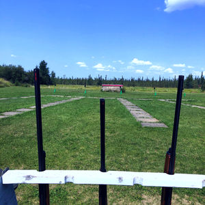 At PCFGA we shoot singles. In singles, the shooters stand 16 yards away from the center of the "trap house" and shoot at random targets that fly at various angles in front of them. Shooters are grouped into squads, usually made up of up to five people. There are five positions that each shooter shoots from, five shots per position, totaling to twenty five shots or one round. This gives participants a different view of the target flying through the air. Each position is a constant 16 yards from the trap house, each one is spaced three feet apart forming a small arc.